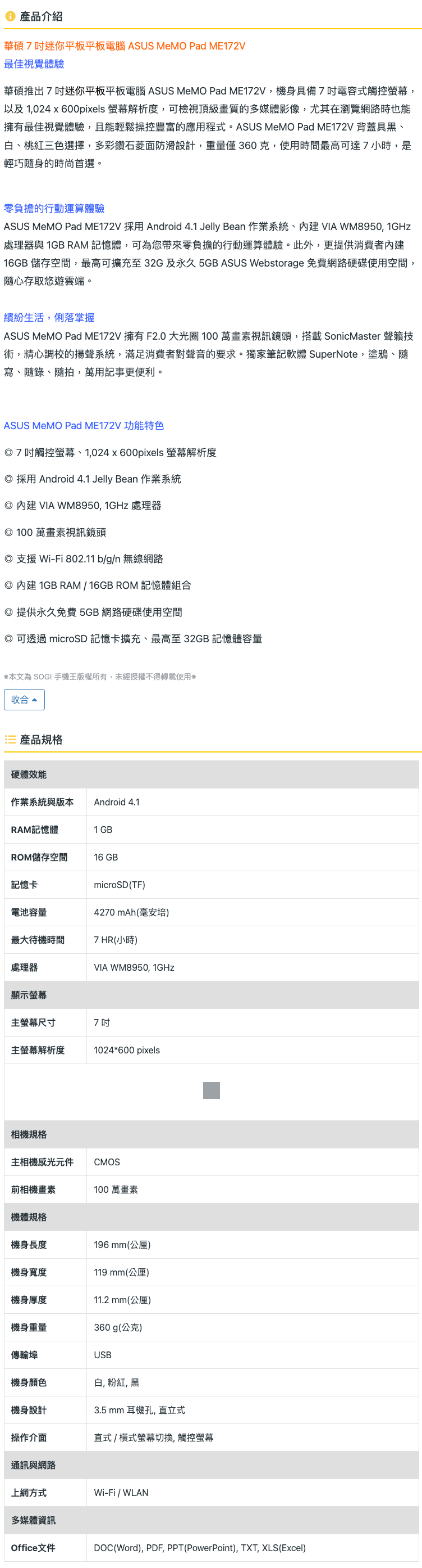 【ASUS】平板電腦(ME172V)